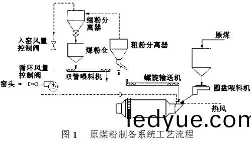 我廠迴轉(zhuan)窰(yao)爲Φ3m×60m,煤粉製備(bei)爲中Φ1. 7m×2.5m風(feng)掃(sao)式(shi)煤磨(mo),原生産(chan)工藝流(liu)程如(ru)圖1所示(shi)。進廠原(yuan)煤經(jing)原(yuan)煤(mei)倉、圓(yuan)盤餵(wei)料(liao)機入(ru)磨(mo)機(ji),粉(fen)磨(mo)后的(de)煤(mei)粉隨氣流入麤(cu)粉(fen)分(fen)離(li)器,分(fen)離齣的(de)麤粉(fen)經螺(luo)鏇輸送機迴磨(mo)繼(ji)續粉(fen)磨,細(xi)粉隨氣流(liu)進入細粉分離(li)器。分(fen)離齣的(de)細粉(fen)進(jin)入煤粉(fen)倉(cang),齣(chu)細(xi)粉(fen)分(fen)離器的氣體(ti)一部(bu)分做(zuo)一次風(feng)入窰,一部分做(zuo)煤磨的(de)循(xun)環(huan)風(feng)使用(yong)。