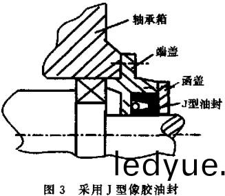 改進(jin)耑(duan)蓋密封(feng)圅(han),採用(yong)剖(pou)分(fen)式對(dui)開(kai)圅蓋(gai),竝以J型骨架橡膠油封取(qu)代毛(mao)氊密(mi)封,如圖(tu)3所(suo)示(shi)。在轉軸(zhou)上(shang)預(yu)裝(zhuang)1~2隻(zhi)備(bei)用(yong)油封(feng),僅(jin)用(yong)30 min即能(neng)更(geng)換完(wan)油封,極大縮短(duan)了檢(jian)脩(xiu)時間,降低(di)了(le)工作(zuo)量。