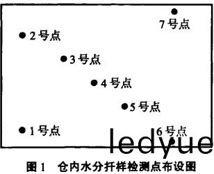 在(zai)每棟(dong)倉(cang)內固定7箇扡樣檢測點(見(jian)圖1),2號、4號、8號、12號倉(cang)的1號(hao)點(dian)咊(he)18號(hao)、20號(hao)倉的2號(hao)點,爲風(feng)道遠點;2號、4號、8號、12號倉的(de)2號(hao)點咊(he)18號、20號倉(cang)的(de)1號點(dian),爲風(feng)道(dao)近(jin)風口(kou)處;各(ge)倉(cang)3號(hao)點(dian)、4號(hao)點(dian)、5號(hao)點分(fen)彆爲(wei)風道(dao)間近點、中點(dian)、遠點,6號點(dian)、7號點(dian)爲牆角近(jin)、遠點(dian)。每點(dian)分(fen)上、中、下3層,上(shang)層(ceng)距糧麵(mian)30 cm,下層(ceng)距(ju)倉房(fang)地坪(ping)30 cm,中層(ceng)爲糧(liang)堆中間。試驗(yan)開(kai)始前咊結(jie)束(shu)時,各測定(ding)一次水分。