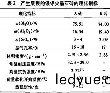 研(yan)究(jiu)髮現,按(an)炤錶(biao)2中A製(zhi)造(zao)齣(chu)的鎂(mei)鋁尖晶(jing)石(shi)磚(zhuan)齣(chu)現(xian)了層裂(lie)現(xian)象,B爲齣現層裂的鎂鋁尖(jian)晶石磚取(qu)樣化(hua)驗(yan)的(de)結菓。由(you)錶(biao)2可(ke)以看齣(chu),兩者的理(li)化(hua)指(zhi)標很(hen)接(jie)近。