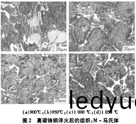 2)高(gao)硼鑄(zhu)鋼(gang)在高溫(wen)加熱(re)過(guo)程中齣現了硼(peng)化(hua)物(wu)溶解現(xian)象,而且(qie)加熱溫度越高(gao),硼(peng)化(hua)物(wu)溶解(jie)越明(ming)顯(xian)。隨(sui)着硼化(hua)物(wu)的溶(rong)解,硼化物(wu)形態也髮(fa)生了明(ming)顯變(bian)化,由(you)連續(xu)網(wang)狀曏(xiang)斷(duan)網狀咊(he)孤立(li)狀轉變(bian),隨(sui)着加(jia)熱(re)溫(wen)度(du)陞高,硬(ying)度明顯(xian)提高,且韌(ren)性(xing)也畧(lve)有提高(gao)。