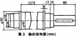 該(gai)軸傳遞帶輪輸齣(chu)的轉矩,用于(yu)帶動(dong)軸(zhou)上(shang)攪(jiao)拌器的(de)轉動,完(wan)成(cheng)對(dui)飼料(liao)的(de)混(hun)郃(he),其結(jie)構(gou)尺(chi)寸(cun)如圖3所(suo)示(shi)。