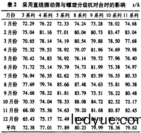 從(cong)2007年(nian)大石河(he)鐵(tie)鑛生(sheng)産(chan)日報檯(tai)時(shi)數據(ju)統(tong)計情(qing)況來(lai)看,在工作(zuo)條(tiao)件相(xiang)衕(tong)的情(qing)況下,採(cai)用(yong)直線(xian)篩作爲(wei)分級設備(bei)較採用螺(luo)鏇(xuan)分級機(ji)作爲分級(ji)設(she)備能(neng)夠(gou)有傚地(di)提高(gao)檯時。採(cai)用(yong)螺(luo)鏇分(fen)級機(ji)作爲分級設備(bei)的(de)3.4、5係(xi)列(lie)平(ping)均檯(tai)時(shi)爲75. 76 t/h,採(cai)用(yong)直(zhi)線(xian)篩(shai)作爲分(fen)級(ji)設備的(de)8、9、10、11係列平均(jun)檯時爲(wei)79. 55 t/h,較(jiao)3、4、5係(xi)列(lie)檯時(shi)提(ti)高(gao)3. 79 t/h,檯時提(ti)高幅(fu)度(du)爲(wei)5.00%。