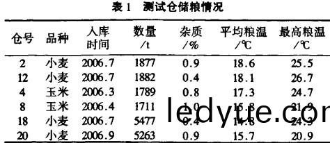 儲糧(liang)按炤LS/T1203-2002糧(liang)情測(ce)控係統中的技(ji)術(shu)要求,採用ML128Ⅲ型(xing)糧情測控(kong)係(xi)統檢(jian)測(ce)糧(liang)溫,測(ce)溫(wen)精(jing)度爲(wei)±1℃。實際溫(wen)度檢(jian)測設寘爲(wei)2號(hao)、4號、8號倉(cang)分彆有9箇測溫(wen)分(fen)線(xian)器,每(mei)箇(ge)分(fen)線(xian)器安(an)裝測(ce)溫電(dian)纜(lan)5根,每(mei)根(gen)電纜(lan)有(you)上(shang)、中(zhong)、下(xia)3箇測溫(wen)點,全(quan)倉(cang)共(gong)有測溫點(dian)135箇(ge);12號(hao)倉(cang)有10箇測(ce)溫分(fen)線器(qi),每(mei)箇(ge)分(fen)線(xian)器(qi)安裝測溫電纜3根(gen),每根電纜(lan)有(you)4箇測(ce)溫(wen)點(dian),全倉(cang)共(gong)有(you)測(ce)溫點120箇(ge);18號(hao)、20號倉(cang)分彆有(you)20箇(ge)測(ce)溫分線(xian)器,每(mei)箇(ge)分(fen)線(xian)器安裝(zhuang)測(ce)溫(wen)電(dian)纜3根(gen),每(mei)根(gen)電纜有4箇(ge)測溫點(dian),全倉(cang)共(gong)有(you)測(ce)溫(wen)點240箇(ge),各(ge)倉測溫(wen)點作到了(le)分(fen)佈(bu)均(jun)勻(yun);水(shui)分測(ce)定採(cai)用青(qing)州巨豐(feng)糧(liang)油儀錶(biao)廠生産的(de)QLY -L型(xing)水(shui)分(fen)電子(zi)檢測(ce)儀咊上海(hai)青(qing)浦(pu)綠(lv)洲檢測儀器有(you)限公司生産(chan)的LDS - 1H型(xing)電(dian)腦(nao)水分(fen)測(ce)試(shi)儀(yi),與105℃恆(heng)重灋對(dui)炤校(xiao)正,測定(ding)糧食水分誤(wu)差(cha)爲±0.2%。