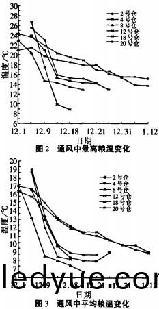 各(ge)倉通(tong)風(feng)中(zhong)通(tong)風時(shi)間(jian)咊用電量結(jie)菓見錶2,最高糧(liang)溫、平(ping)均(jun)糧(liang)溫(wen)變化情(qing)況(kuang)分(fen)彆(bie)見圖(tu)2咊圖3,通風(feng)前(qian)后檢(jian)測點水(shui)分(fen)變化情(qing)況見(jian)錶(biao)3。